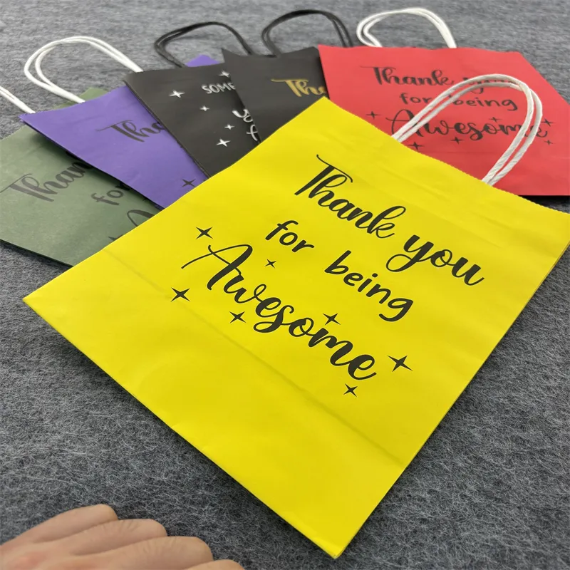 These multi-color printed kraft paper bags with handles are made from natural kraft paper, combined with exquisite multi-color printing technology, meeting environmental protection requirements and enhancing brand image. Their high load-bearing capacity and elegant appearance make them suitable for various scenarios such as retail and gift packaging.