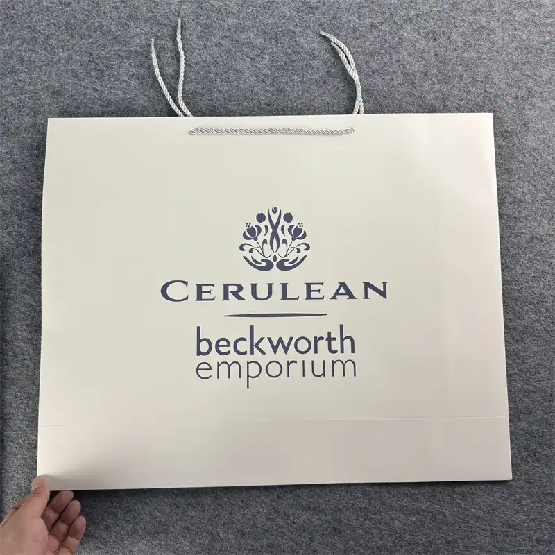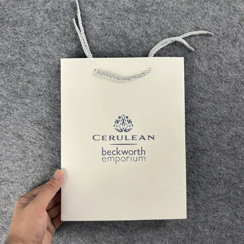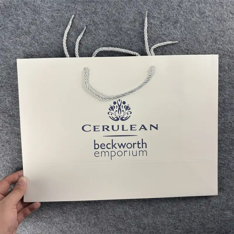 Load-Bearing Capacity: White cardboard bags have strong load-bearing capacity, suitable for packaging goods of varying weights, from clothing to books. 3. **Appearance Design:** Smooth surface, vibrant colors, and custom printing available to meet brand needs, offering high visual appeal.